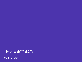 Hex #4c34ad Color is a normal indigo color and the nearest color is Ocean Blue #4f42b5. Hex code #4c34ad and RGB value is rgb(76,52,173). In RGB color space, this color is composed of 30% red, 20% green, 68% blue, In CMYK color space, this color is composed of 56% cyan, 70% magenta, 0% yellow , 32% black , In HSL color space, this color has a hue angle of 252° , 54% saturation and 44% lightness.