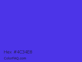 Hex #4c34e8 Color is a normal indigo color and the nearest color is Han Purple #5218fa. Hex code #4c34e8 and RGB value is rgb(76,52,232). In RGB color space, this color is composed of 30% red, 20% green, 91% blue, In CMYK color space, this color is composed of 67% cyan, 78% magenta, 0% yellow , 9% black , In HSL color space, this color has a hue angle of 248° , 80% saturation and 56% lightness.