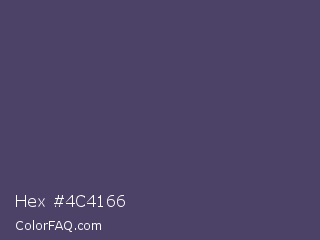 Hex #4c4166 Color is a normal indigo color and the nearest color is Mulled Wine #4e4562. Hex code #4c4166 and RGB value is rgb(76,65,102). In RGB color space, this color is composed of 30% red, 25% green, 40% blue, In CMYK color space, this color is composed of 25% cyan, 36% magenta, 0% yellow , 60% black , In HSL color space, this color has a hue angle of 258° , 22% saturation and 33% lightness.