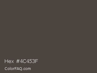 Hex #4c453f Color is a dark orange color and the nearest color is Tundora #4a4244. Hex code #4c453f and RGB value is rgb(76,69,63). In RGB color space, this color is composed of 30% red, 27% green, 25% blue, In CMYK color space, this color is composed of 0% cyan, 9% magenta, 17% yellow , 70% black , In HSL color space, this color has a hue angle of 28° , 9% saturation and 27% lightness.
