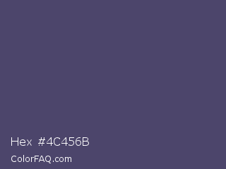 Hex #4c456b Color is a normal indigo color and the nearest color is Mulled Wine #4e4562. Hex code #4c456b and RGB value is rgb(76,69,107). In RGB color space, this color is composed of 30% red, 27% green, 42% blue, In CMYK color space, this color is composed of 29% cyan, 36% magenta, 0% yellow , 58% black , In HSL color space, this color has a hue angle of 251° , 22% saturation and 35% lightness.
