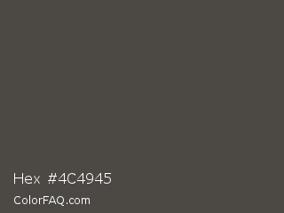 Hex #4c4945 Color is a dark orange color and the nearest color is Emperor #514649. Hex code #4c4945 and RGB value is rgb(76,73,69). In RGB color space, this color is composed of 30% red, 29% green, 27% blue, In CMYK color space, this color is composed of 0% cyan, 4% magenta, 9% yellow , 70% black , In HSL color space, this color has a hue angle of 34° , 5% saturation and 28% lightness.