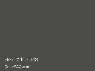 Hex #4c4d48 Color is a dark lime color and the nearest color is Emperor #514649. Hex code #4c4d48 and RGB value is rgb(76,77,72). In RGB color space, this color is composed of 30% red, 30% green, 28% blue, In CMYK color space, this color is composed of 1% cyan, 0% magenta, 6% yellow , 70% black , In HSL color space, this color has a hue angle of 72° , 3% saturation and 29% lightness.