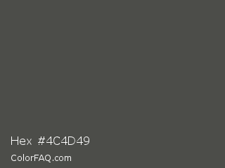 Hex #4c4d49 Color is a dark lime color and the nearest color is Emperor #514649. Hex code #4c4d49 and RGB value is rgb(76,77,73). In RGB color space, this color is composed of 30% red, 30% green, 29% blue, In CMYK color space, this color is composed of 1% cyan, 0% magenta, 5% yellow , 70% black , In HSL color space, this color has a hue angle of 75° , 3% saturation and 29% lightness.