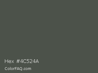 Hex #4c524a Color is a normal green color and the nearest color is Fuscous Gray #54534d. Hex code #4c524a and RGB value is rgb(76,82,74). In RGB color space, this color is composed of 30% red, 32% green, 29% blue, In CMYK color space, this color is composed of 7% cyan, 0% magenta, 10% yellow , 68% black , In HSL color space, this color has a hue angle of 105° , 5% saturation and 31% lightness.