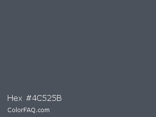 Hex #4c525b Color is a normal blue color and the nearest color is Trout #4a4e5a. Hex code #4c525b and RGB value is rgb(76,82,91). In RGB color space, this color is composed of 30% red, 32% green, 36% blue, In CMYK color space, this color is composed of 16% cyan, 10% magenta, 0% yellow , 64% black , In HSL color space, this color has a hue angle of 216° , 9% saturation and 33% lightness.