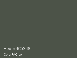 Hex #4c5348 Color is a dark green color and the nearest color is Gray Asparagus #465945. Hex code #4c5348 and RGB value is rgb(76,83,72). In RGB color space, this color is composed of 30% red, 33% green, 28% blue, In CMYK color space, this color is composed of 8% cyan, 0% magenta, 13% yellow , 67% black , In HSL color space, this color has a hue angle of 98° , 7% saturation and 30% lightness.