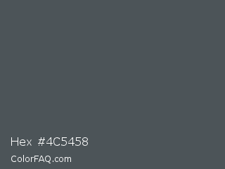 Hex #4c5458 Color is a normal blue color and the nearest color is Abbey #4c4f56. Hex code #4c5458 and RGB value is rgb(76,84,88). In RGB color space, this color is composed of 30% red, 33% green, 35% blue, In CMYK color space, this color is composed of 14% cyan, 5% magenta, 0% yellow , 65% black , In HSL color space, this color has a hue angle of 200° , 7% saturation and 32% lightness.
