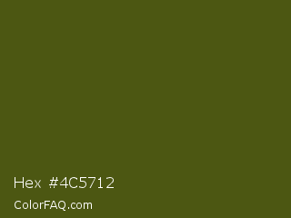 Hex #4c5712 Color is a very dark yellow color and the nearest color is Saratoga #555b10. Hex code #4c5712 and RGB value is rgb(76,87,18). In RGB color space, this color is composed of 30% red, 34% green, 7% blue, In CMYK color space, this color is composed of 13% cyan, 0% magenta, 79% yellow , 66% black , In HSL color space, this color has a hue angle of 70° , 66% saturation and 21% lightness.
