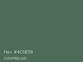 Hex #4c6b58 Color is a normal green color and the nearest color is Finlandia #556d56. Hex code #4c6b58 and RGB value is rgb(76,107,88). In RGB color space, this color is composed of 30% red, 42% green, 35% blue, In CMYK color space, this color is composed of 29% cyan, 0% magenta, 18% yellow , 58% black , In HSL color space, this color has a hue angle of 143° , 17% saturation and 36% lightness.