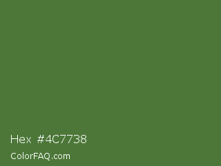 Hex #4c7738 Color is a normal green color and the nearest color is Fern Green #4f7942. Hex code #4c7738 and RGB value is rgb(76,119,56). In RGB color space, this color is composed of 30% red, 47% green, 22% blue, In CMYK color space, this color is composed of 36% cyan, 0% magenta, 53% yellow , 53% black , In HSL color space, this color has a hue angle of 101° , 36% saturation and 34% lightness.
