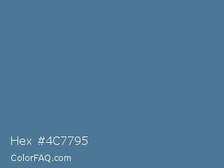 Hex #4c7795 Color is a normal blue color and the nearest color is Kashmir Blue #507096. Hex code #4c7795 and RGB value is rgb(76,119,149). In RGB color space, this color is composed of 30% red, 47% green, 58% blue, In CMYK color space, this color is composed of 49% cyan, 20% magenta, 0% yellow , 42% black , In HSL color space, this color has a hue angle of 205° , 32% saturation and 44% lightness.
