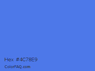 Hex #4c78e9 Color is a light blue color and the nearest color is Blueberry #4f86f7. Hex code #4c78e9 and RGB value is rgb(76,120,233). In RGB color space, this color is composed of 30% red, 47% green, 91% blue, In CMYK color space, this color is composed of 67% cyan, 48% magenta, 0% yellow , 9% black , In HSL color space, this color has a hue angle of 223° , 78% saturation and 61% lightness.