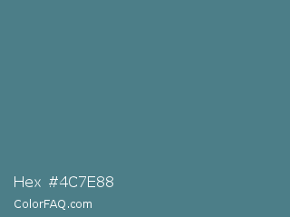 Hex #4c7e88 Color is a normal cyan color and the nearest color is Smalt Blue #51808f. Hex code #4c7e88 and RGB value is rgb(76,126,136). In RGB color space, this color is composed of 30% red, 49% green, 53% blue, In CMYK color space, this color is composed of 44% cyan, 7% magenta, 0% yellow , 47% black , In HSL color space, this color has a hue angle of 190° , 28% saturation and 42% lightness.