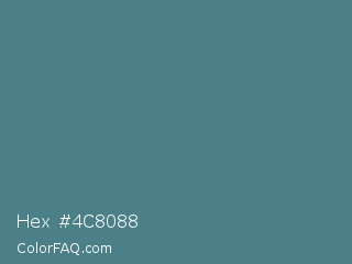 Hex #4c8088 Color is a normal cyan color and the nearest color is Smalt Blue #51808f. Hex code #4c8088 and RGB value is rgb(76,128,136). In RGB color space, this color is composed of 30% red, 50% green, 53% blue, In CMYK color space, this color is composed of 44% cyan, 6% magenta, 0% yellow , 47% black , In HSL color space, this color has a hue angle of 188° , 28% saturation and 42% lightness.