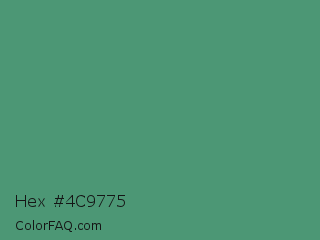 Hex #4c9775 Color is a normal green color and the nearest color is Wintergreen Dream #56887d. Hex code #4c9775 and RGB value is rgb(76,151,117). In RGB color space, this color is composed of 30% red, 59% green, 46% blue, In CMYK color space, this color is composed of 50% cyan, 0% magenta, 23% yellow , 41% black , In HSL color space, this color has a hue angle of 153° , 33% saturation and 45% lightness.