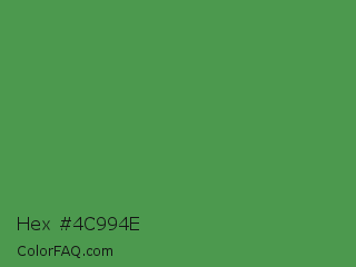 Hex #4c994e Color is a normal green color and the nearest color is May Green #4c9141. Hex code #4c994e and RGB value is rgb(76,153,78). In RGB color space, this color is composed of 30% red, 60% green, 31% blue, In CMYK color space, this color is composed of 50% cyan, 0% magenta, 49% yellow , 40% black , In HSL color space, this color has a hue angle of 122° , 34% saturation and 45% lightness.