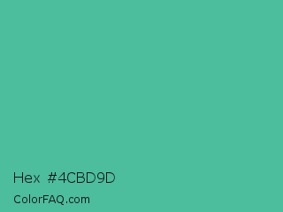Hex #4cbd9d Color is a normal green color and the nearest color is Ocean Green #48bf91. Hex code #4cbd9d and RGB value is rgb(76,189,157). In RGB color space, this color is composed of 30% red, 74% green, 62% blue, In CMYK color space, this color is composed of 60% cyan, 0% magenta, 17% yellow , 26% black , In HSL color space, this color has a hue angle of 163° , 46% saturation and 52% lightness.