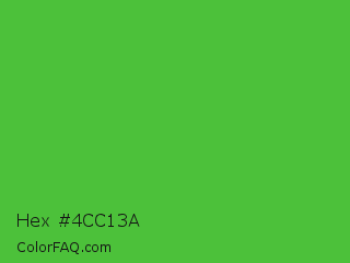 Hex #4cc13a Color is a normal green color and the nearest color is Apple #4fa83d. Hex code #4cc13a and RGB value is rgb(76,193,58). In RGB color space, this color is composed of 30% red, 76% green, 23% blue, In CMYK color space, this color is composed of 61% cyan, 0% magenta, 70% yellow , 24% black , In HSL color space, this color has a hue angle of 112° , 54% saturation and 49% lightness.