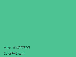 Hex #4cc393 Color is a normal green color and the nearest color is Ocean Green #48bf91. Hex code #4cc393 and RGB value is rgb(76,195,147). In RGB color space, this color is composed of 30% red, 76% green, 58% blue, In CMYK color space, this color is composed of 61% cyan, 0% magenta, 25% yellow , 24% black , In HSL color space, this color has a hue angle of 156° , 50% saturation and 53% lightness.