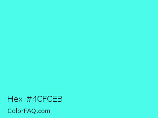 Hex #4cfceb Color is a light cyan color and the nearest color is Turquoise #40e0d0. Hex code #4cfceb and RGB value is rgb(76,252,235). In RGB color space, this color is composed of 30% red, 99% green, 92% blue, In CMYK color space, this color is composed of 70% cyan, 0% magenta, 7% yellow , 1% black , In HSL color space, this color has a hue angle of 174° , 97% saturation and 64% lightness.
