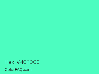 Hex #4cfdc0 Color is a light green color and the nearest color is Turquoise #40e0d0. Hex code #4cfdc0 and RGB value is rgb(76,253,192). In RGB color space, this color is composed of 30% red, 99% green, 75% blue, In CMYK color space, this color is composed of 70% cyan, 0% magenta, 24% yellow , 1% black , In HSL color space, this color has a hue angle of 159° , 98% saturation and 65% lightness.