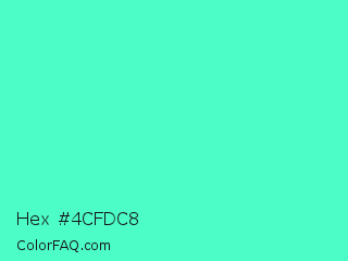 Hex #4cfdc8 Color is a light green color and the nearest color is Turquoise #40e0d0. Hex code #4cfdc8 and RGB value is rgb(76,253,200). In RGB color space, this color is composed of 30% red, 99% green, 78% blue, In CMYK color space, this color is composed of 70% cyan, 0% magenta, 21% yellow , 1% black , In HSL color space, this color has a hue angle of 162° , 98% saturation and 65% lightness.