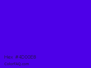 Hex #4d00e8 Color is a normal indigo color and the nearest color is Electric Ultramarine #3f00ff. Hex code #4d00e8 and RGB value is rgb(77,0,232). In RGB color space, this color is composed of 30% red, 0% green, 91% blue, In CMYK color space, this color is composed of 67% cyan, 100% magenta, 0% yellow , 9% black , In HSL color space, this color has a hue angle of 260° , 100% saturation and 45% lightness.