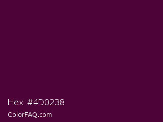 Hex #4d0238 Color is a very dark magenta color and the nearest color is Blackberry #4d0135. Hex code #4d0238 and RGB value is rgb(77,2,56). In RGB color space, this color is composed of 30% red, 1% green, 22% blue, In CMYK color space, this color is composed of 0% cyan, 97% magenta, 27% yellow , 70% black , In HSL color space, this color has a hue angle of 317° , 95% saturation and 15% lightness.