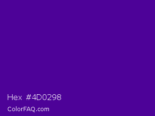 Hex #4d0298 Color is a dark violet color and the nearest color is Pigment Indigo #4b0082. Hex code #4d0298 and RGB value is rgb(77,2,152). In RGB color space, this color is composed of 30% red, 1% green, 60% blue, In CMYK color space, this color is composed of 49% cyan, 99% magenta, 0% yellow , 40% black , In HSL color space, this color has a hue angle of 270° , 97% saturation and 30% lightness.