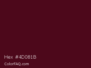 Hex #4d081b Color is a very dark rose color and the nearest color is Cab Sav #4d0a18. Hex code #4d081b and RGB value is rgb(77,8,27). In RGB color space, this color is composed of 30% red, 3% green, 11% blue, In CMYK color space, this color is composed of 0% cyan, 90% magenta, 65% yellow , 70% black , In HSL color space, this color has a hue angle of 343° , 81% saturation and 17% lightness.