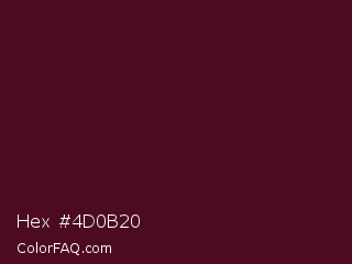 Hex #4d0b20 Color is a very dark rose color and the nearest color is Cab Sav #4d0a18. Hex code #4d0b20 and RGB value is rgb(77,11,32). In RGB color space, this color is composed of 30% red, 4% green, 13% blue, In CMYK color space, this color is composed of 0% cyan, 86% magenta, 58% yellow , 70% black , In HSL color space, this color has a hue angle of 341° , 75% saturation and 17% lightness.