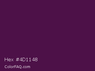 Hex #4d1148 Color is a very dark magenta color and the nearest color is Loulou #460b41. Hex code #4d1148 and RGB value is rgb(77,17,72). In RGB color space, this color is composed of 30% red, 7% green, 28% blue, In CMYK color space, this color is composed of 0% cyan, 78% magenta, 6% yellow , 70% black , In HSL color space, this color has a hue angle of 305° , 64% saturation and 18% lightness.
