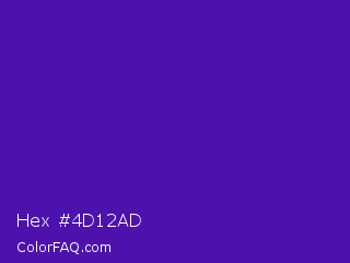 Hex #4d12ad Color is a normal violet color and the nearest color is Daisy Bush #4f2398. Hex code #4d12ad and RGB value is rgb(77,18,173). In RGB color space, this color is composed of 30% red, 7% green, 68% blue, In CMYK color space, this color is composed of 55% cyan, 90% magenta, 0% yellow , 32% black , In HSL color space, this color has a hue angle of 263° , 81% saturation and 37% lightness.