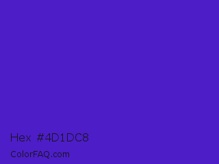 Hex #4d1dc8 Color is a normal indigo color and the nearest color is Interdimensional Blue #360ccc. Hex code #4d1dc8 and RGB value is rgb(77,29,200). In RGB color space, this color is composed of 30% red, 11% green, 78% blue, In CMYK color space, this color is composed of 62% cyan, 86% magenta, 0% yellow , 22% black , In HSL color space, this color has a hue angle of 257° , 75% saturation and 45% lightness.