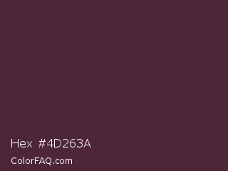 Hex #4d263a Color is a dark rose color and the nearest color is Livid Brown #4d282e. Hex code #4d263a and RGB value is rgb(77,38,58). In RGB color space, this color is composed of 30% red, 15% green, 23% blue, In CMYK color space, this color is composed of 0% cyan, 51% magenta, 25% yellow , 70% black , In HSL color space, this color has a hue angle of 329° , 34% saturation and 23% lightness.