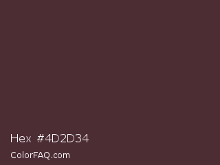 Hex #4d2d34 Color is a dark red color and the nearest color is Woody Brown #483131. Hex code #4d2d34 and RGB value is rgb(77,45,52). In RGB color space, this color is composed of 30% red, 18% green, 20% blue, In CMYK color space, this color is composed of 0% cyan, 42% magenta, 32% yellow , 70% black , In HSL color space, this color has a hue angle of 347° , 26% saturation and 24% lightness.