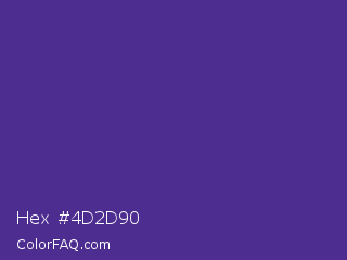 Hex #4d2d90 Color is a normal indigo color and the nearest color is KSU Purple #512888. Hex code #4d2d90 and RGB value is rgb(77,45,144). In RGB color space, this color is composed of 30% red, 18% green, 56% blue, In CMYK color space, this color is composed of 47% cyan, 69% magenta, 0% yellow , 44% black , In HSL color space, this color has a hue angle of 259° , 52% saturation and 37% lightness.
