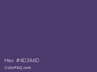 Hex #4d3a6d Color is a normal violet color and the nearest color is Mulled Wine #4e4562. Hex code #4d3a6d and RGB value is rgb(77,58,109). In RGB color space, this color is composed of 30% red, 23% green, 43% blue, In CMYK color space, this color is composed of 29% cyan, 47% magenta, 0% yellow , 57% black , In HSL color space, this color has a hue angle of 262° , 31% saturation and 33% lightness.