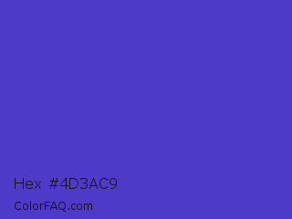 Hex #4d3ac9 Color is a normal indigo color and the nearest color is Ocean Blue #4f42b5. Hex code #4d3ac9 and RGB value is rgb(77,58,201). In RGB color space, this color is composed of 30% red, 23% green, 79% blue, In CMYK color space, this color is composed of 62% cyan, 71% magenta, 0% yellow , 21% black , In HSL color space, this color has a hue angle of 248° , 57% saturation and 51% lightness.