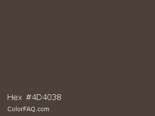 Hex #4d4038 Color is a dark orange color and the nearest color is Dark Puce #4f3a3c. Hex code #4d4038 and RGB value is rgb(77,64,56). In RGB color space, this color is composed of 30% red, 25% green, 22% blue, In CMYK color space, this color is composed of 0% cyan, 17% magenta, 27% yellow , 70% black , In HSL color space, this color has a hue angle of 23° , 16% saturation and 26% lightness.