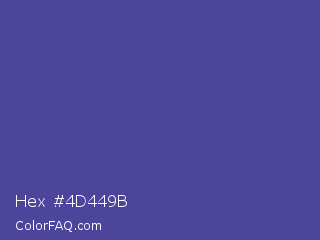 Hex #4d449b Color is a normal indigo color and the nearest color is Victoria #534491. Hex code #4d449b and RGB value is rgb(77,68,155). In RGB color space, this color is composed of 30% red, 27% green, 61% blue, In CMYK color space, this color is composed of 50% cyan, 56% magenta, 0% yellow , 39% black , In HSL color space, this color has a hue angle of 246° , 39% saturation and 44% lightness.