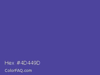 Hex #4d449d Color is a normal indigo color and the nearest color is Gigas #523c94. Hex code #4d449d and RGB value is rgb(77,68,157). In RGB color space, this color is composed of 30% red, 27% green, 62% blue, In CMYK color space, this color is composed of 51% cyan, 57% magenta, 0% yellow , 38% black , In HSL color space, this color has a hue angle of 246° , 40% saturation and 44% lightness.