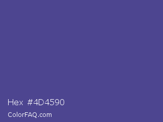 Hex #4d4590 Color is a normal indigo color and the nearest color is Victoria #534491. Hex code #4d4590 and RGB value is rgb(77,69,144). In RGB color space, this color is composed of 30% red, 27% green, 56% blue, In CMYK color space, this color is composed of 47% cyan, 52% magenta, 0% yellow , 44% black , In HSL color space, this color has a hue angle of 246° , 35% saturation and 42% lightness.