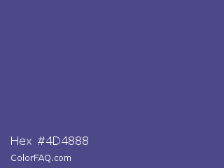 Hex #4d4888 Color is a normal indigo color and the nearest color is Victoria #534491. Hex code #4d4888 and RGB value is rgb(77,72,136). In RGB color space, this color is composed of 30% red, 28% green, 53% blue, In CMYK color space, this color is composed of 43% cyan, 47% magenta, 0% yellow , 47% black , In HSL color space, this color has a hue angle of 245° , 31% saturation and 41% lightness.