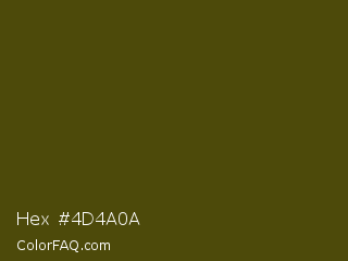 Hex #4d4a0a Color is a very dark yellow color and the nearest color is Bronze Olive #4e420c. Hex code #4d4a0a and RGB value is rgb(77,74,10). In RGB color space, this color is composed of 30% red, 29% green, 4% blue, In CMYK color space, this color is composed of 0% cyan, 4% magenta, 87% yellow , 70% black , In HSL color space, this color has a hue angle of 57° , 77% saturation and 17% lightness.