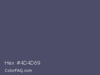 Hex #4d4d69 Color is a normal blue color and the nearest color is Independence #4c516d. Hex code #4d4d69 and RGB value is rgb(77,77,105). In RGB color space, this color is composed of 30% red, 30% green, 41% blue, In CMYK color space, this color is composed of 27% cyan, 27% magenta, 0% yellow , 59% black , In HSL color space, this color has a hue angle of 240° , 15% saturation and 36% lightness.