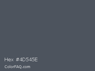 Hex #4d545e Color is a normal blue color and the nearest color is Trout #4a4e5a. Hex code #4d545e and RGB value is rgb(77,84,94). In RGB color space, this color is composed of 30% red, 33% green, 37% blue, In CMYK color space, this color is composed of 18% cyan, 11% magenta, 0% yellow , 63% black , In HSL color space, this color has a hue angle of 215° , 10% saturation and 34% lightness.
