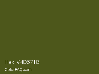 Hex #4d571b Color is a very dark yellow color and the nearest color is Army Green #4b5320. Hex code #4d571b and RGB value is rgb(77,87,27). In RGB color space, this color is composed of 30% red, 34% green, 11% blue, In CMYK color space, this color is composed of 11% cyan, 0% magenta, 69% yellow , 66% black , In HSL color space, this color has a hue angle of 70° , 53% saturation and 22% lightness.