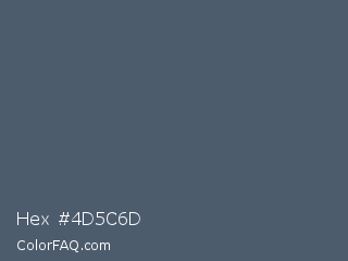 Hex #4d5c6d Color is a normal blue color and the nearest color is Deep Space Sparkle #4a646c. Hex code #4d5c6d and RGB value is rgb(77,92,109). In RGB color space, this color is composed of 30% red, 36% green, 43% blue, In CMYK color space, this color is composed of 29% cyan, 16% magenta, 0% yellow , 57% black , In HSL color space, this color has a hue angle of 212° , 17% saturation and 36% lightness.